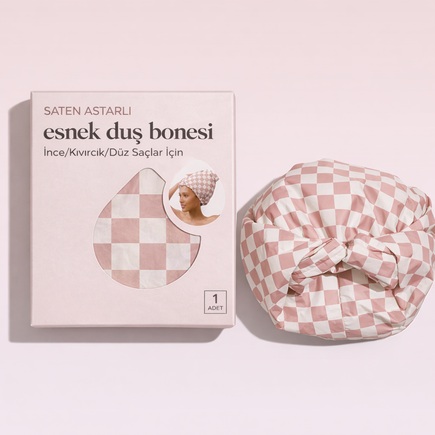 Modern kareli tasarımıyla, yeniden kullanılabilir ve saten astarlı duş bonesi sayesinde saçlarınızı duş sırasında koruyun, bakımlı ve düzgün kalmasını sağlayın.